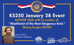 Start your America250 celebration with a January 28, Author Talk featuring Todd Mildfelt and David Schafer, co-writers of “Abolitionist of the Most Dangerous Kind,” the bold story of James Montgomery, fearless abolitionist who led the 2nd South Carolina, a regiment of Black soldiers in the Civil War. Learn More About the January KS250 Author Talk.